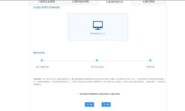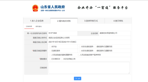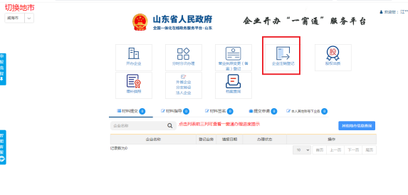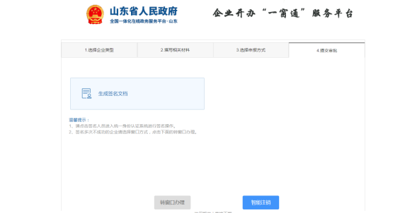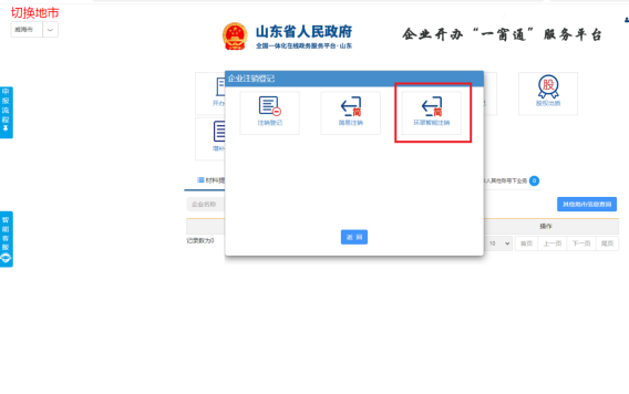 1.登录山东政务服务网,进入企业开办“一窗通”平台,点击“企业注销登记”,选择“环翠智能注销”。