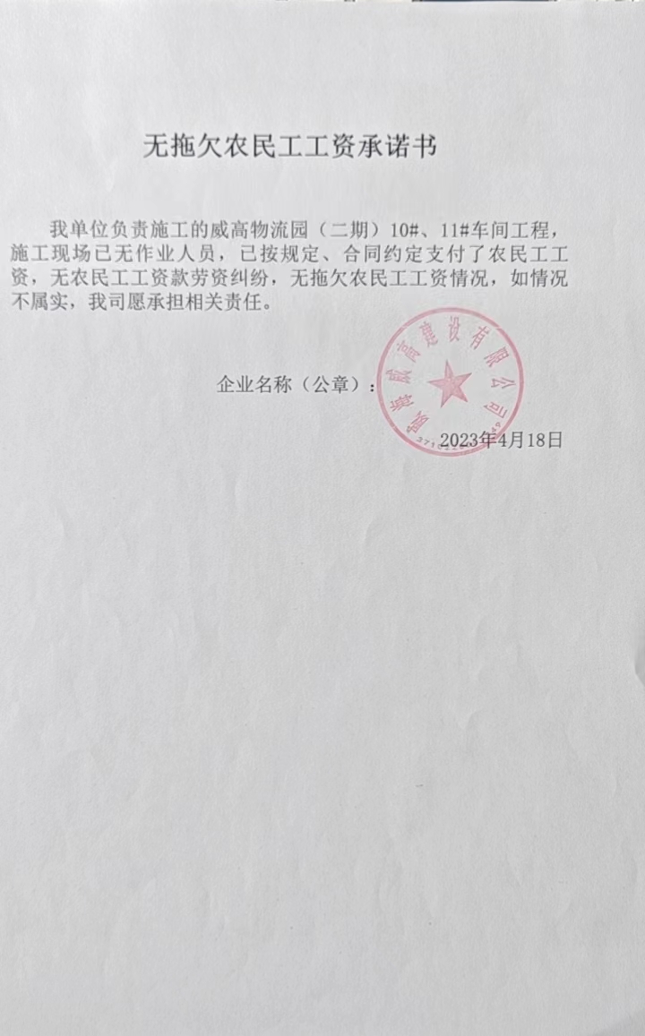威高物流园10#11#车间项目已于2023年04月18日完工。该项目建设单位威海威高物流控股有限公司申请退还农民工工资保证金,依据《威海市人力资源和社会保障局等7部门关于印发<工程建设领域农民工工资保证金管理实施细则>的通知》规定,现对项目出具的《无拖欠农民工工资承诺书》进行网站公示,自发布之日起30天。若该项目拖欠农民工工资,请反映人及时联系我们,联系电话0631-5210357,逾期视为无拖欠农民工工资。