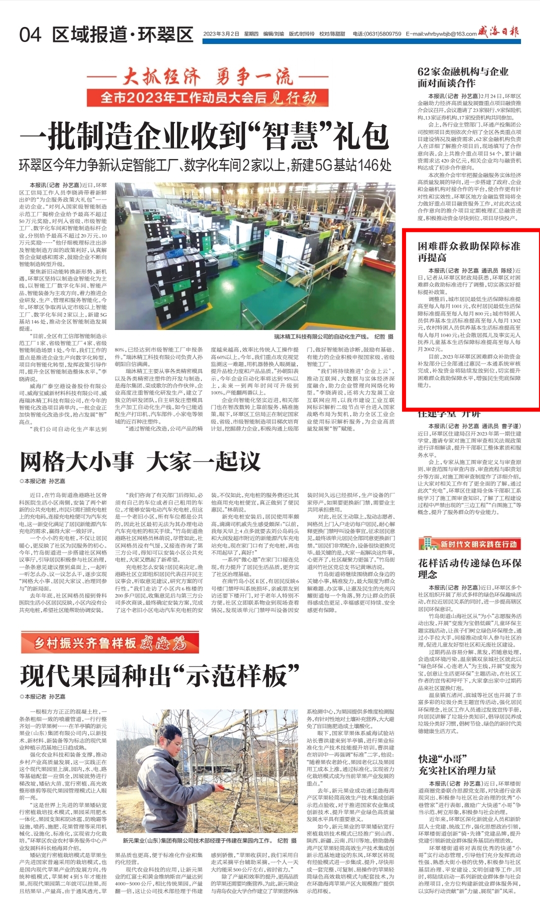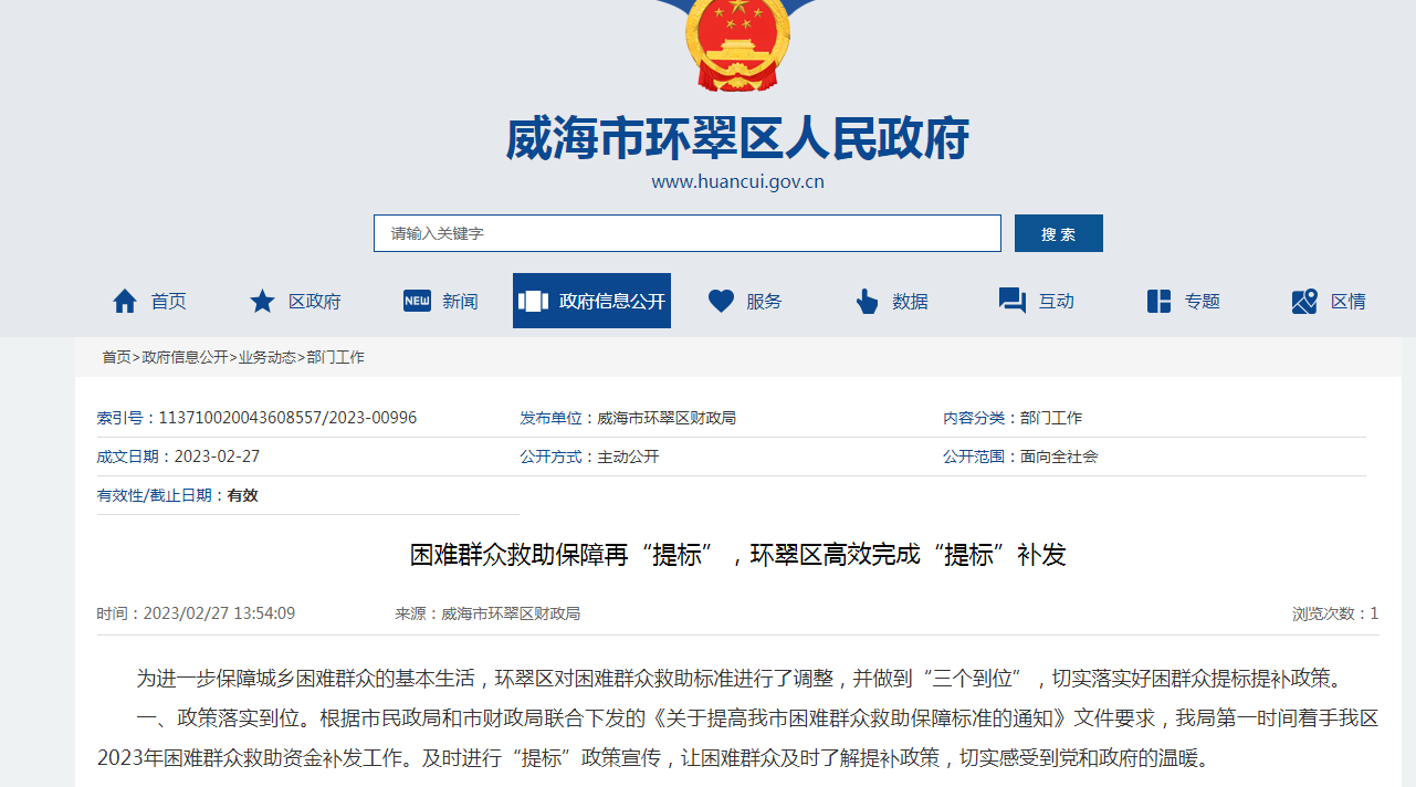 一是借力线上网络平台,政策宣传到位。为加大居民对困难群众救助政策的充分了解,环翠区财政局第一时间在区政府门户网站对困难群众救助最新补助标准进行信息公开,并充分利用“威海日报”、“最威海是环翠”等媒体进行全方位、多渠道宣传,提高惠民政策的覆盖面和知晓度。
