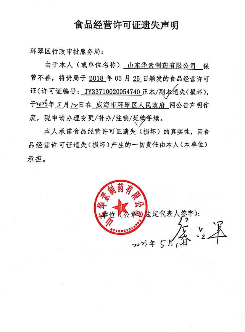 关于山东华素制药有限公司食品经营许可证的遗失声明