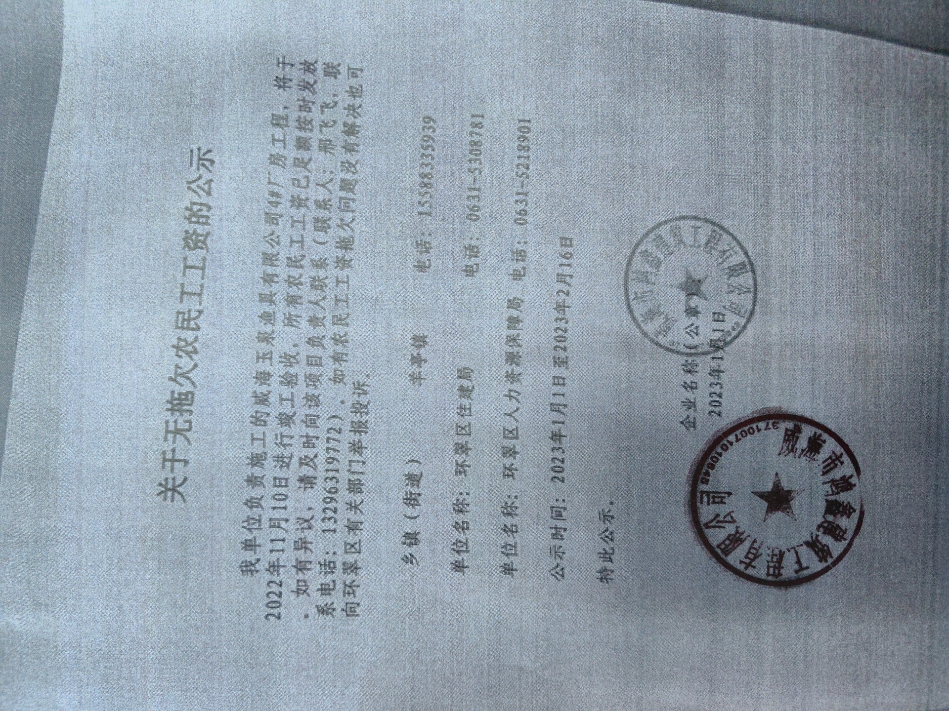 威海玉泉渔具有限公司4#厂房项目已于2022年11月10日完工。该项目施工单位威海市鸿鑫建筑工程有限公司及建设单位威海玉泉渔具有限公司申请退还农民工工资保证金,依据《威海市人力资源和社会保障局等7部门关于印发<工程建设领域农民工工资保证金管理实施细则>的通知》规定,现对项目出具的《无拖欠农民工工资承诺书》进行网站公示,自发布之日起30天。