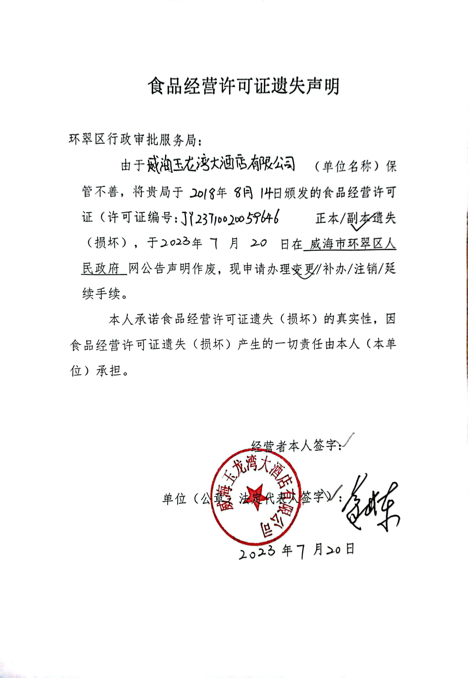 关于威海玉龙湾大酒店有限公司食品经营许可证的遗失声明