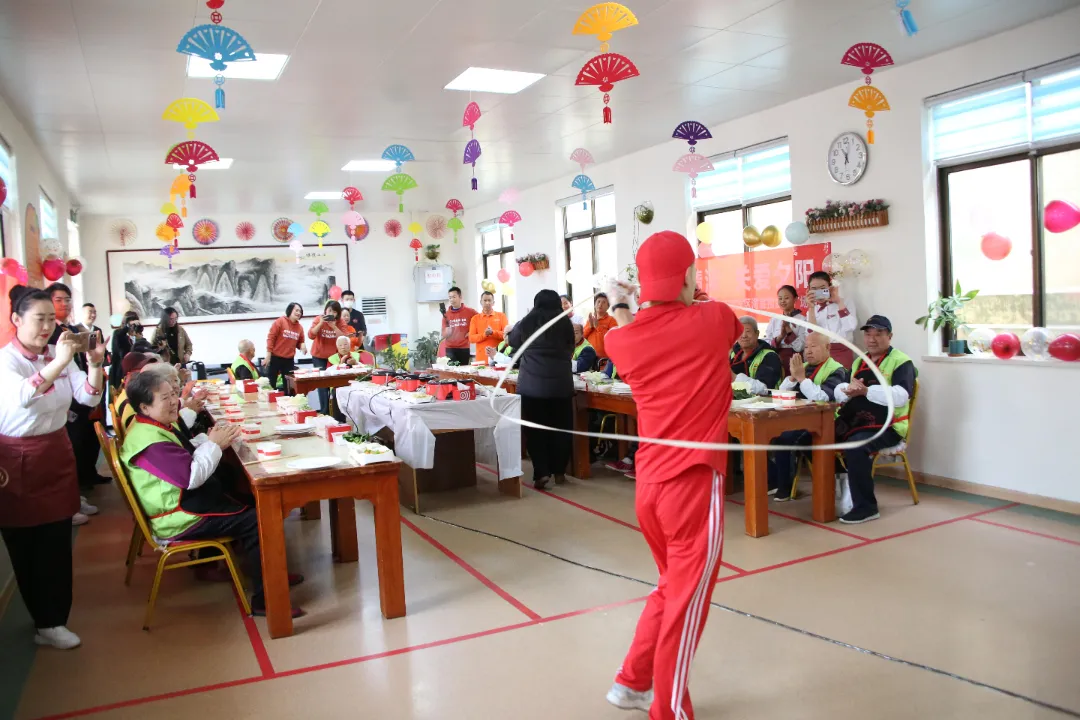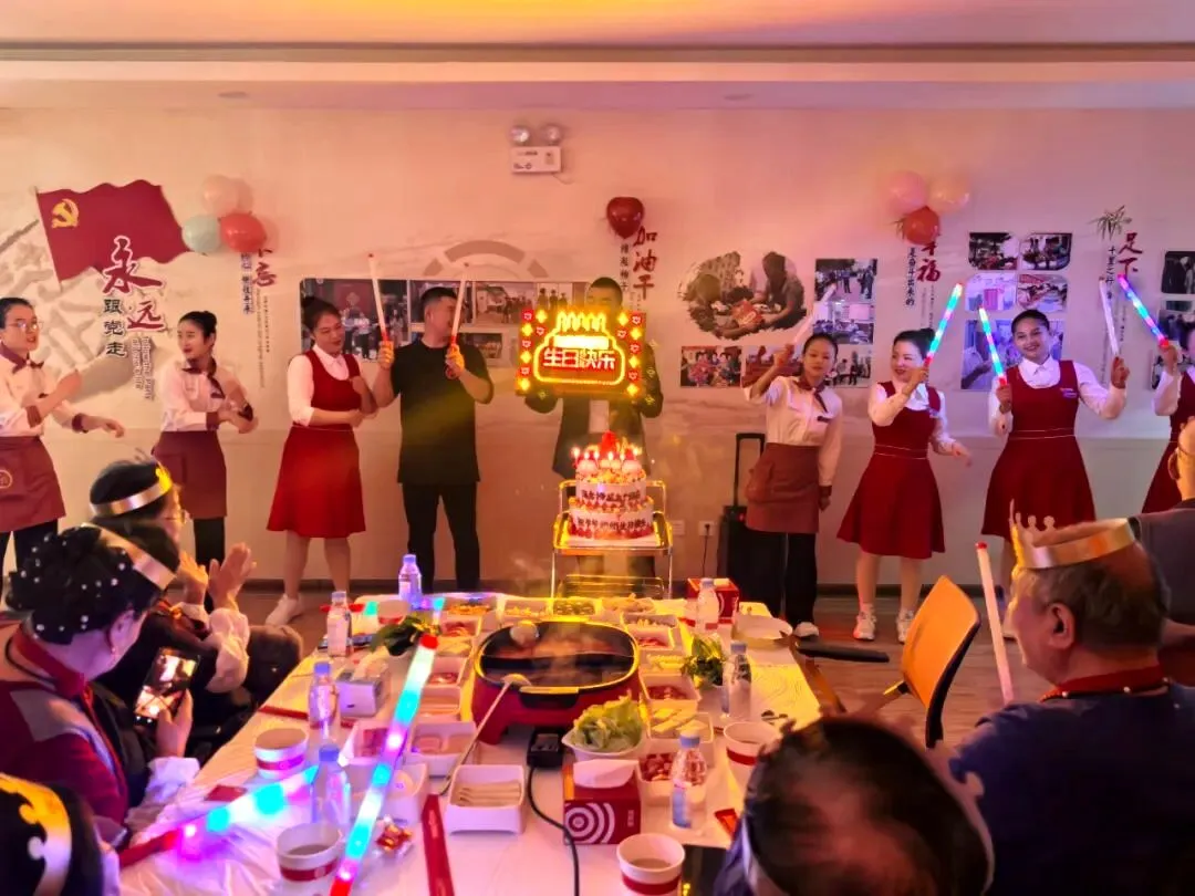 与此同时,在东北村社区,一场以“诚信指数”为撬动点的“长者生日会暨诚信表彰主题活动”也在热闹进行中。此次活动由东北村社区与西南村社区携手举办,旨在通过为老人们庆生的温馨形式,彰显诚信的价值与力量,营造和谐美好的社区氛围。宴会开始前,海底捞的工作人员早早来到社区二楼活动室,齐心协力将活动室装扮得温馨满满、氛围感十足。提前来到会场的老人,享受着海底捞工作人员提供的手部按摩“VIP 星级”服务。然而,精彩远不止于此。海底捞威高广场店不仅为寿星们准备了美味可口的菜肴,还呈上了自家令人赞叹的绝活——“甩面”“变脸”等精彩绝伦的节目表演,为在场的寿星们献上了一场美轮美奂的视觉盛宴。伴随着欢快的生日歌旋律悠然响起,生日会正式进入高潮。工作人员缓缓地将生日蛋糕推进来,欢快的音乐节奏瞬间带动着现场老人情不自禁地哼唱起来,将整场生日会的氛围推至顶点。随后,大家一同许愿、吹蜡烛,分享蛋糕与火锅,畅聊着家庭琐事,幸福的笑容绽放在每个人的脸庞。