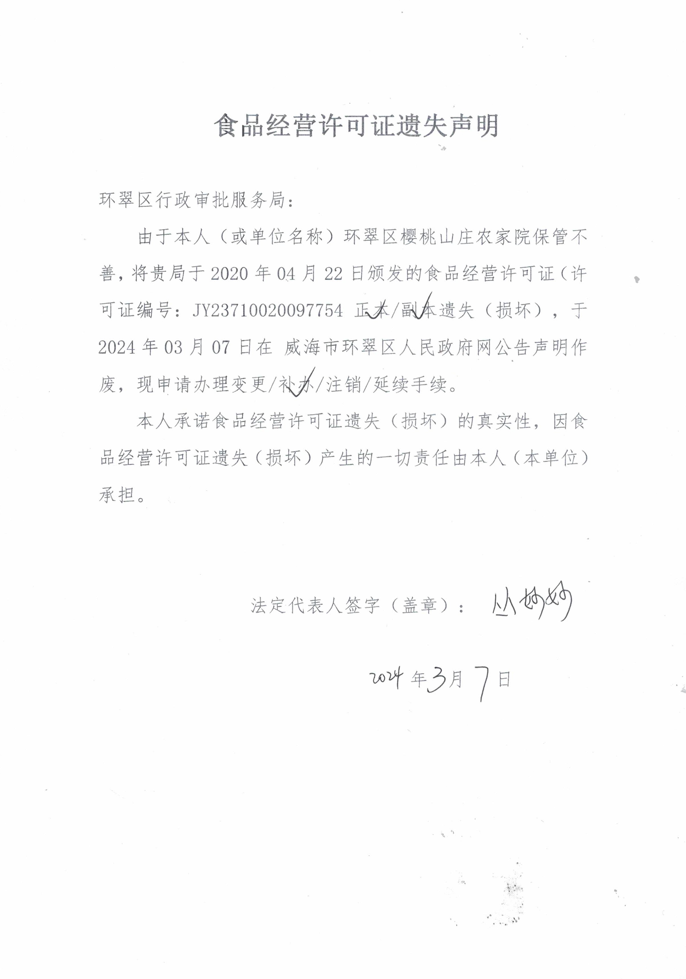 关于环翠区樱桃山庄农家院食品经营许可证的遗失声明
