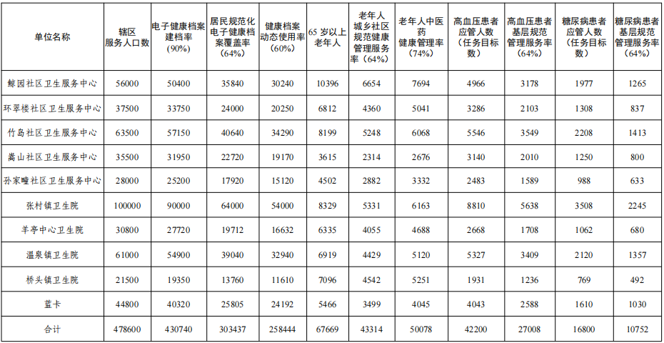(一)居民健康档案管理。健全完善居民电子健康档案务实应用50项,要依据《国家基本公共卫生服务规范(山东2017年版)》,通过多种渠道动态更新和完善档案内容。居民健康档案规范化电子建档率≥90%,居民规范化电子档案覆盖率≥64%,电子健康档案动态使用率≥60%,档案复核升级完成率100%,进一步提高居民健康档案规范性和真实性。