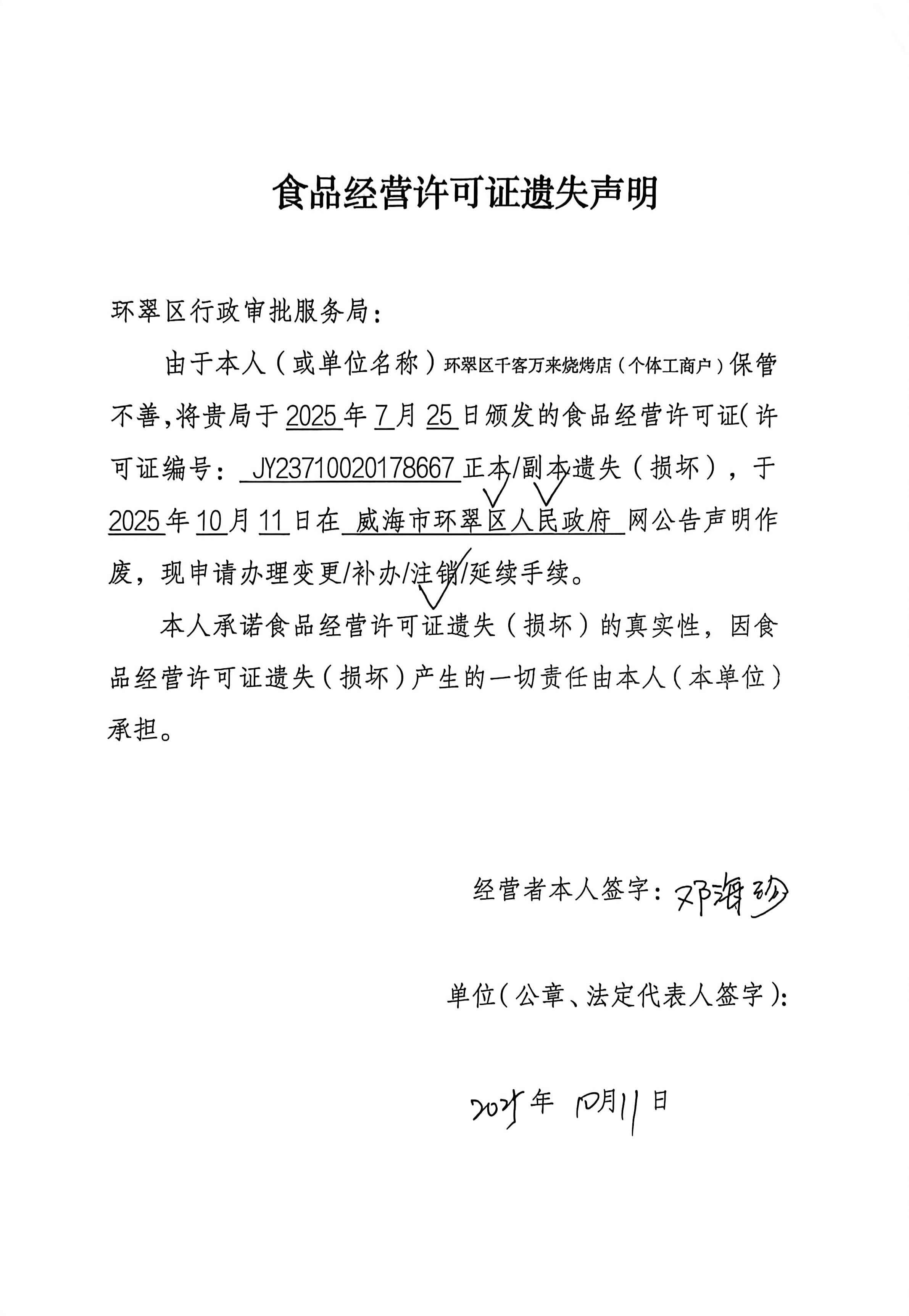 关于环翠区千客万来烧烤店(个体工商户)食品经营许可证的遗失声明