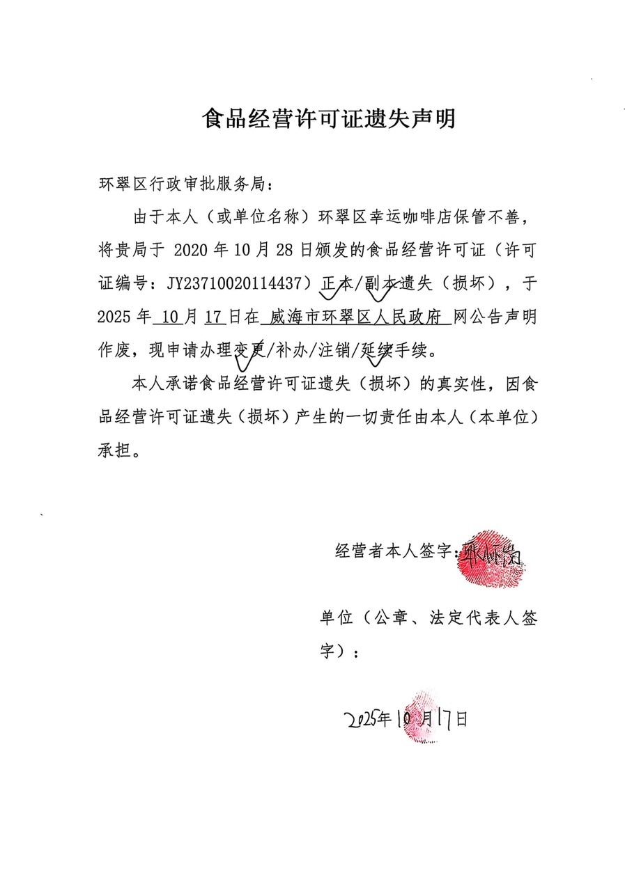 关于环翠区幸运咖啡店食品经营许可证的遗失声明