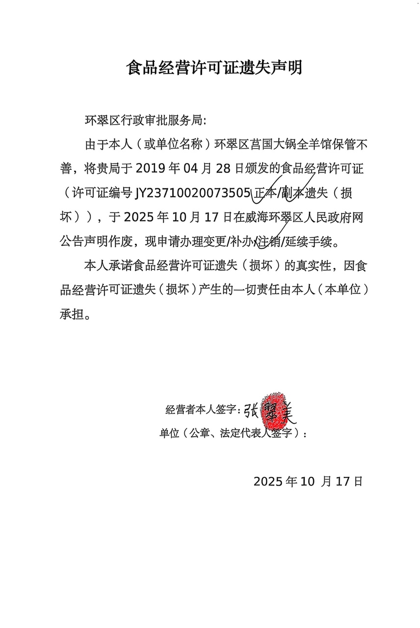 关于环翠区莒国大锅全羊馆食品经营许可证的遗失声明
