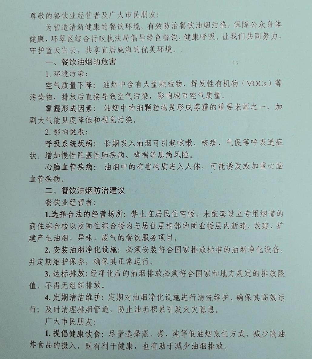 环翠区综合行政执法局为更好的组织开展餐饮油烟集中整治行动,研究制定了《餐饮油烟整治工作方案》,并印制了2000份《致环翠区饮食业经营业主的一封信》。通过在区行政审批服务局审批窗口放置和组织执法人员上门发放两种渠道进行宣传,提高全区餐饮经营者的法治观念和环保意识,引导餐饮经营者积极参与餐饮油烟整治工作。