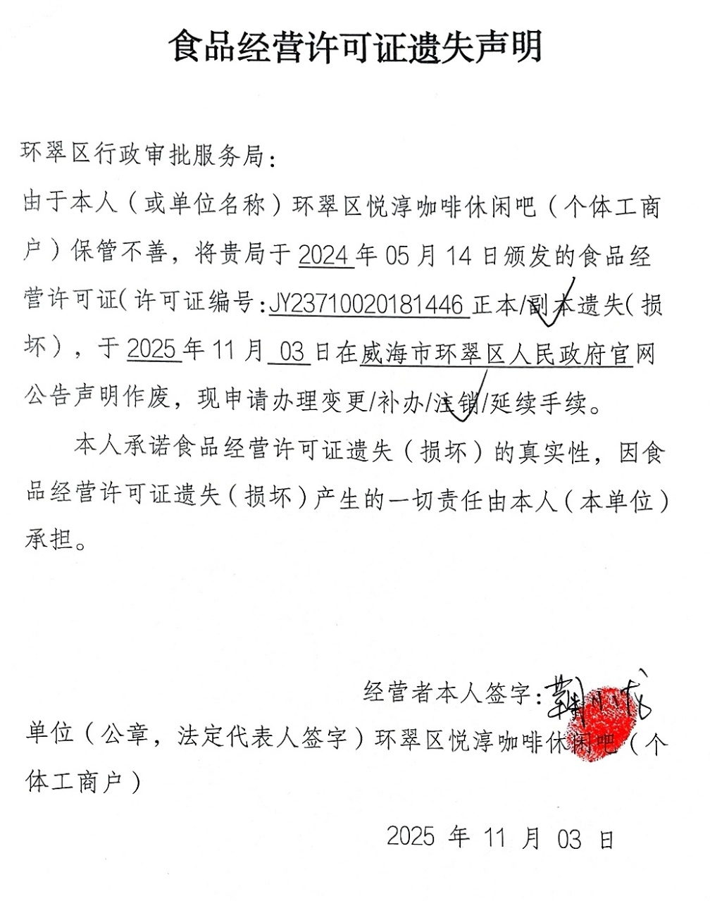 关于环翠区悦淳咖啡休闲吧(个体工商户)食品经营许可证的遗失声明