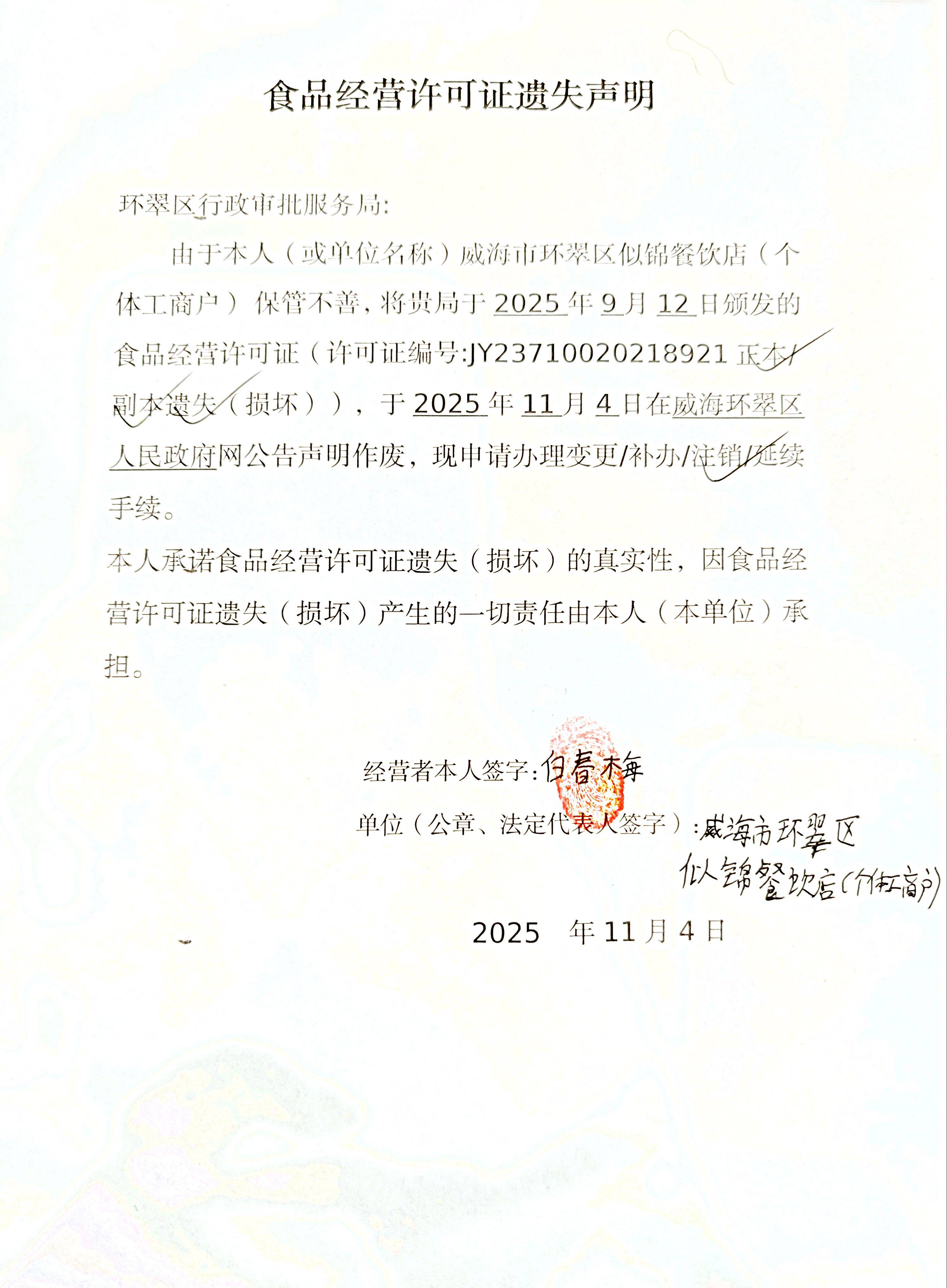 关于威海市环翠区似锦餐饮店(个体工商户)食品经营许可证的遗失声明