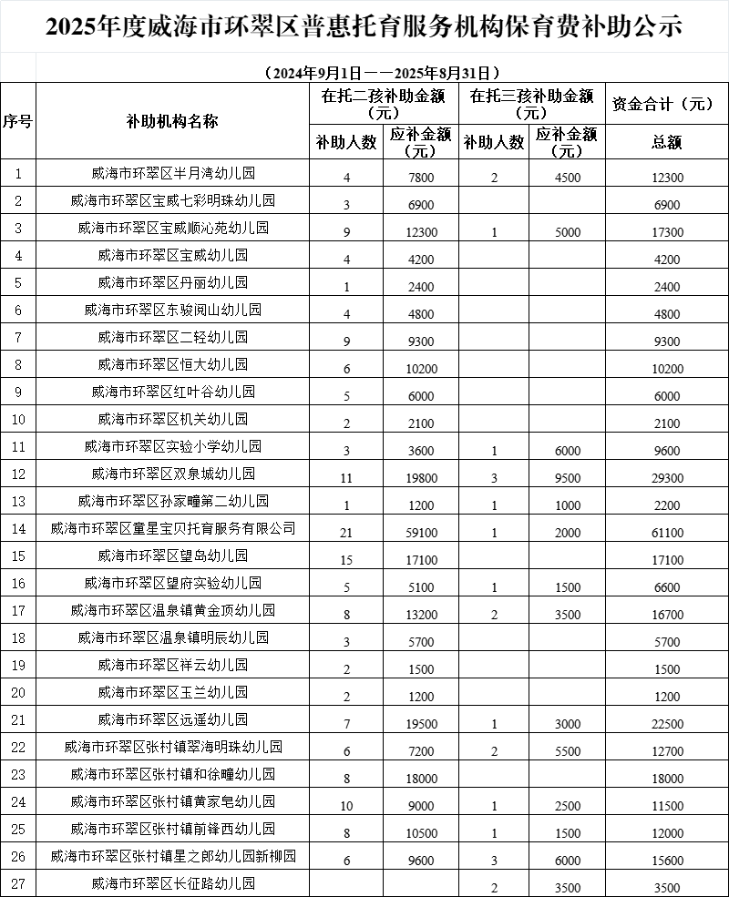 2025年度威海市环翠区普惠托育服务机构保育费补助公示