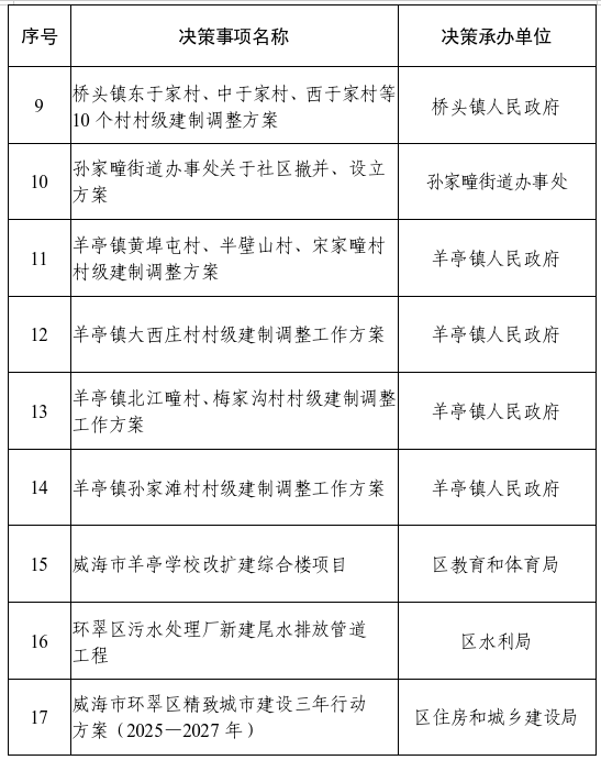 威海市环翠区人民政府2025年度重大行政决策事项目录(调整后)