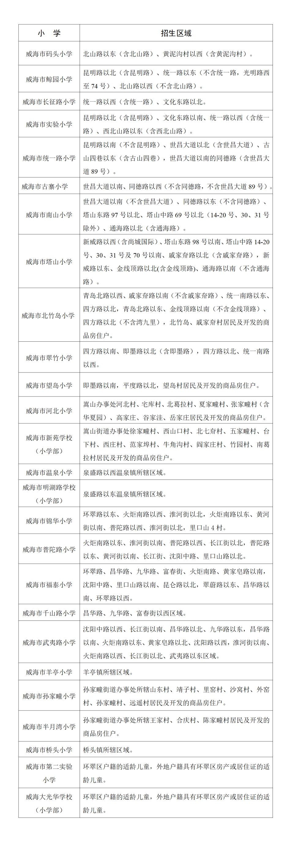 1. 小学招生对象:环翠区户籍及外来务工人员随迁子女年满6周岁的适龄儿童。