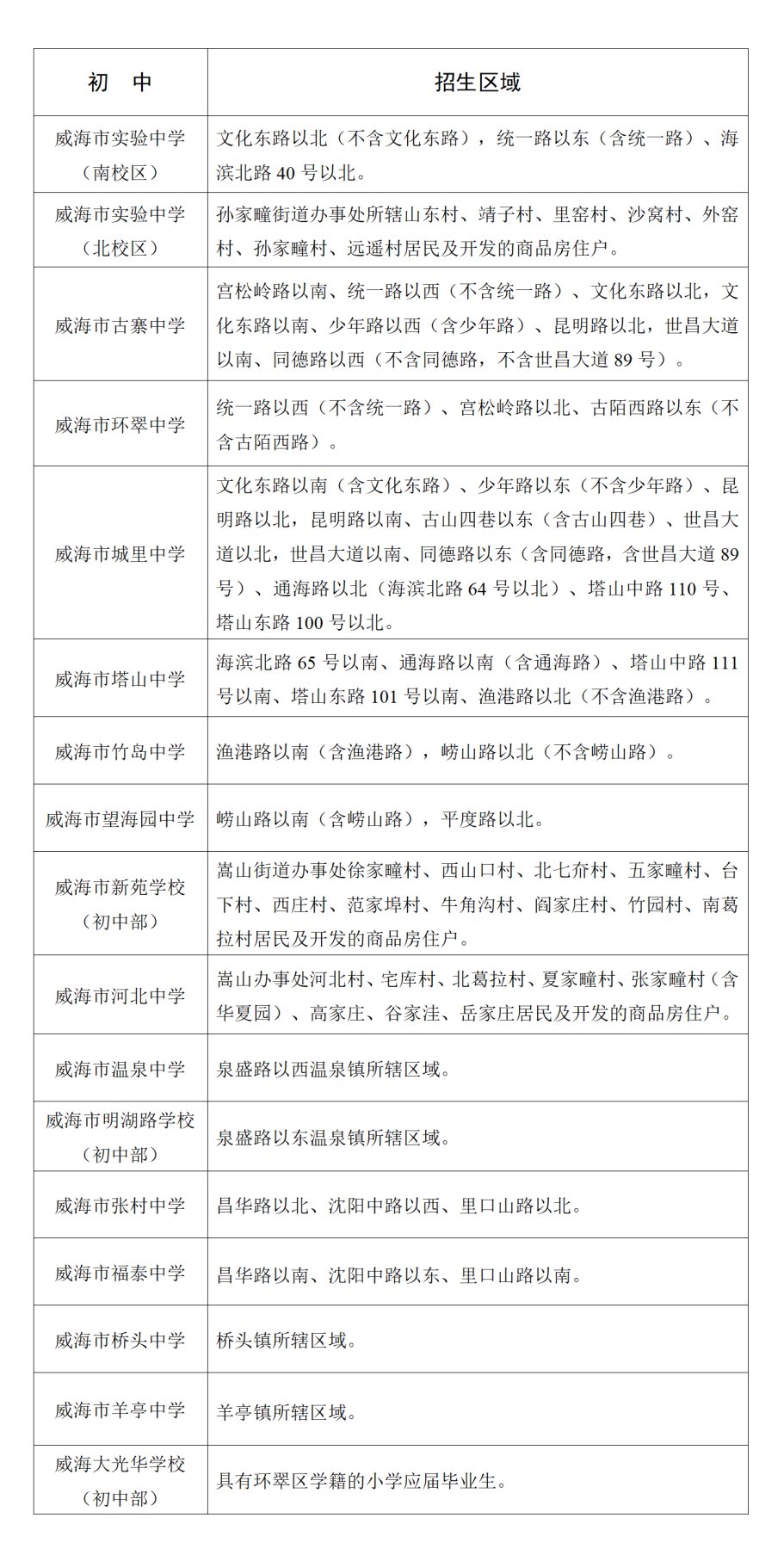 2. 初中招生对象:环翠区户籍及外来务工人员随迁子女的小学应届毕业生。