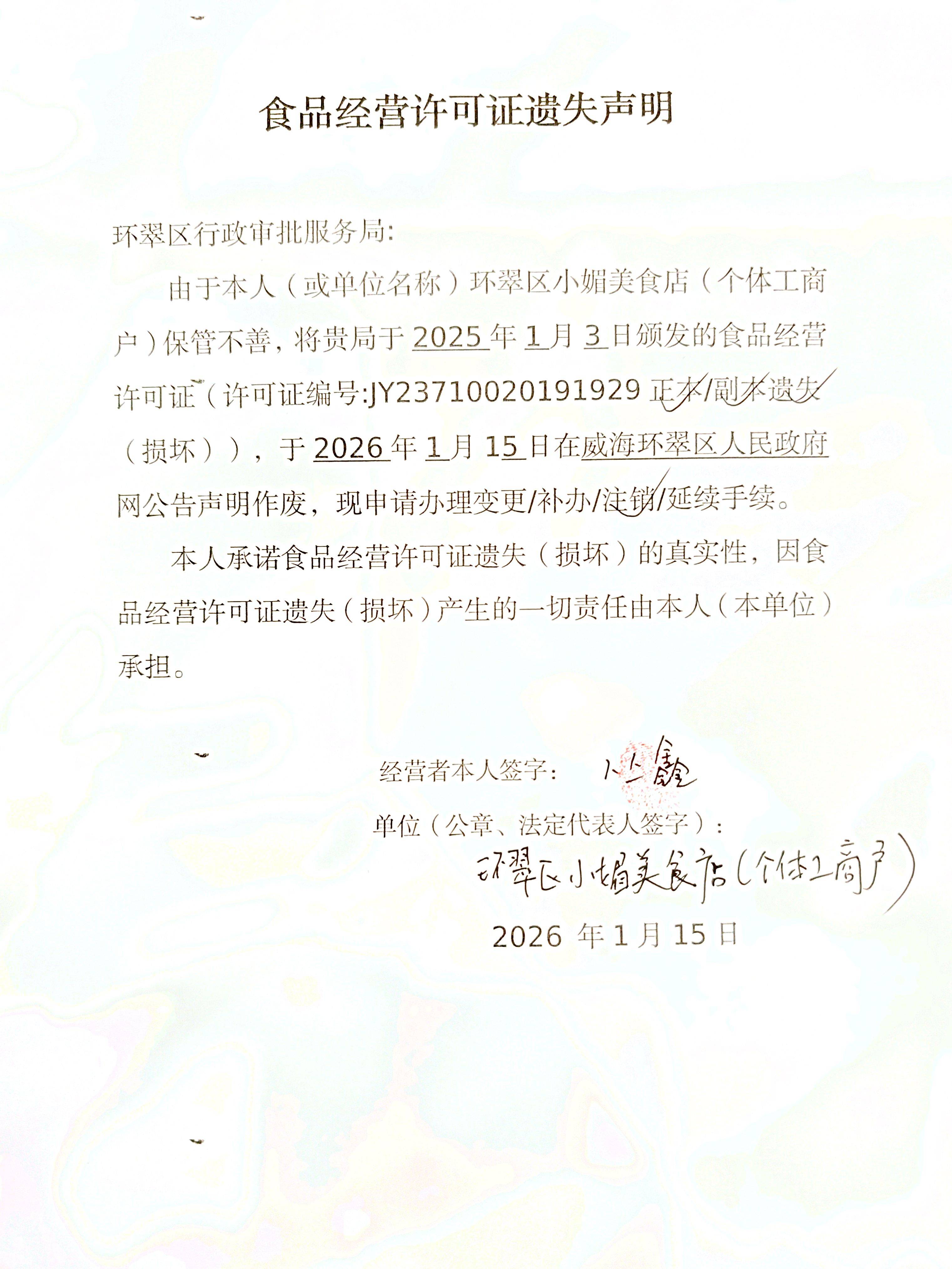 关于环翠区小媚美食店(个体工商户)食品经营许可证的遗失声明