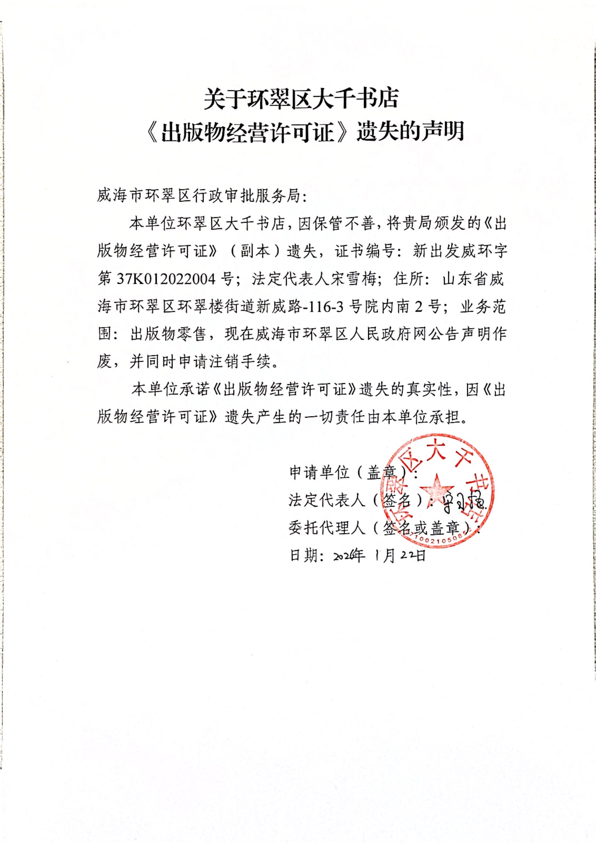 关于环翠区大千书店出版物经营许可证的遗失声明