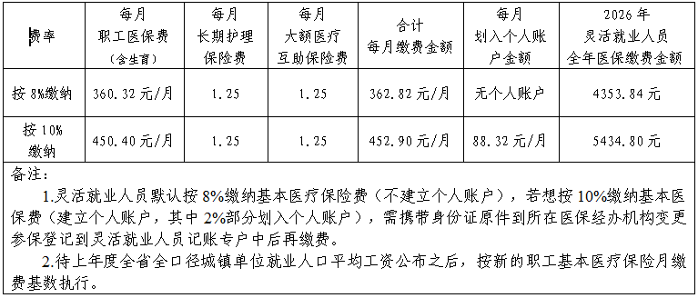 2026年度灵活就业人员基本医疗保险集中缴费期已开始,为保障您的医保待遇享受,请及时足额缴纳医疗保险。