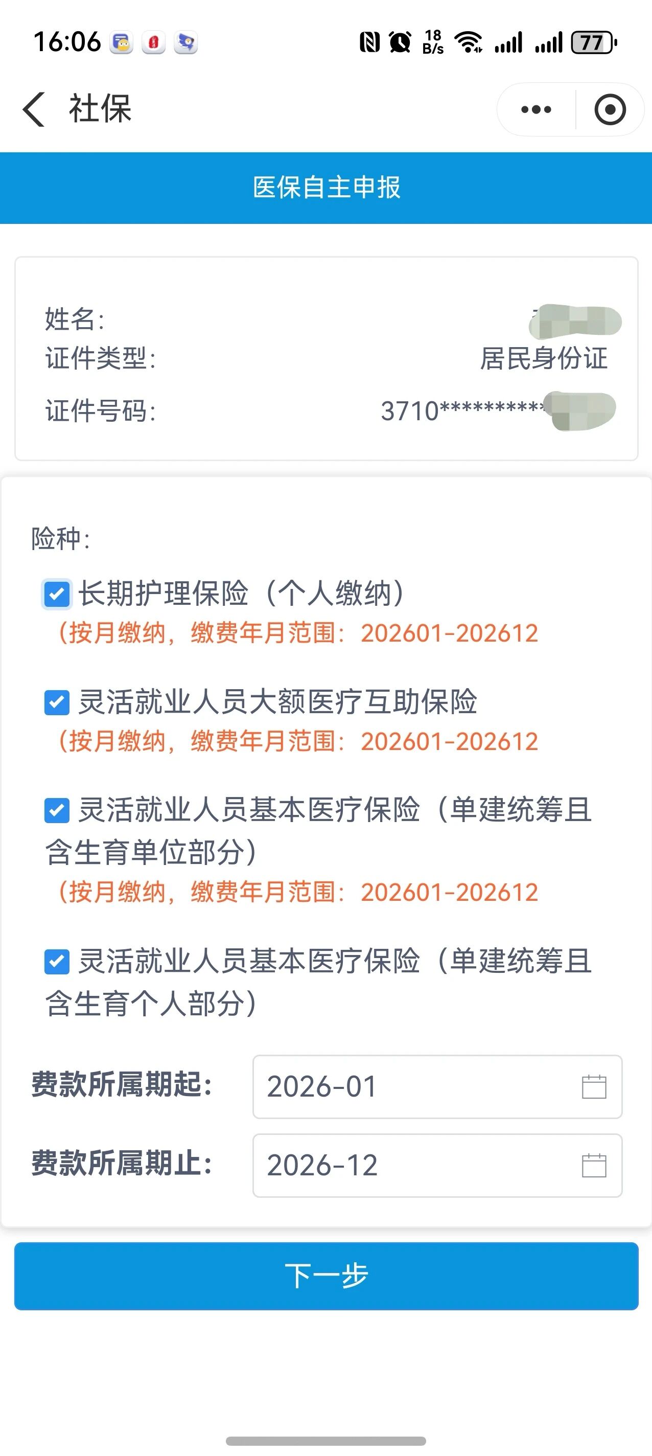 2.勾选灵活就业人员基本医疗保险(单建统筹且含生育单位部分)、灵活就业人员基本医疗保险(单建统筹且含生育个人部分)、灵活就业人员大额医疗互助保险、长期护理保险(个人部分)四个险种,选择费款所属期起始、终止月份(缴纳全年选择2026-01至2026-12),然后点击“下一步”;