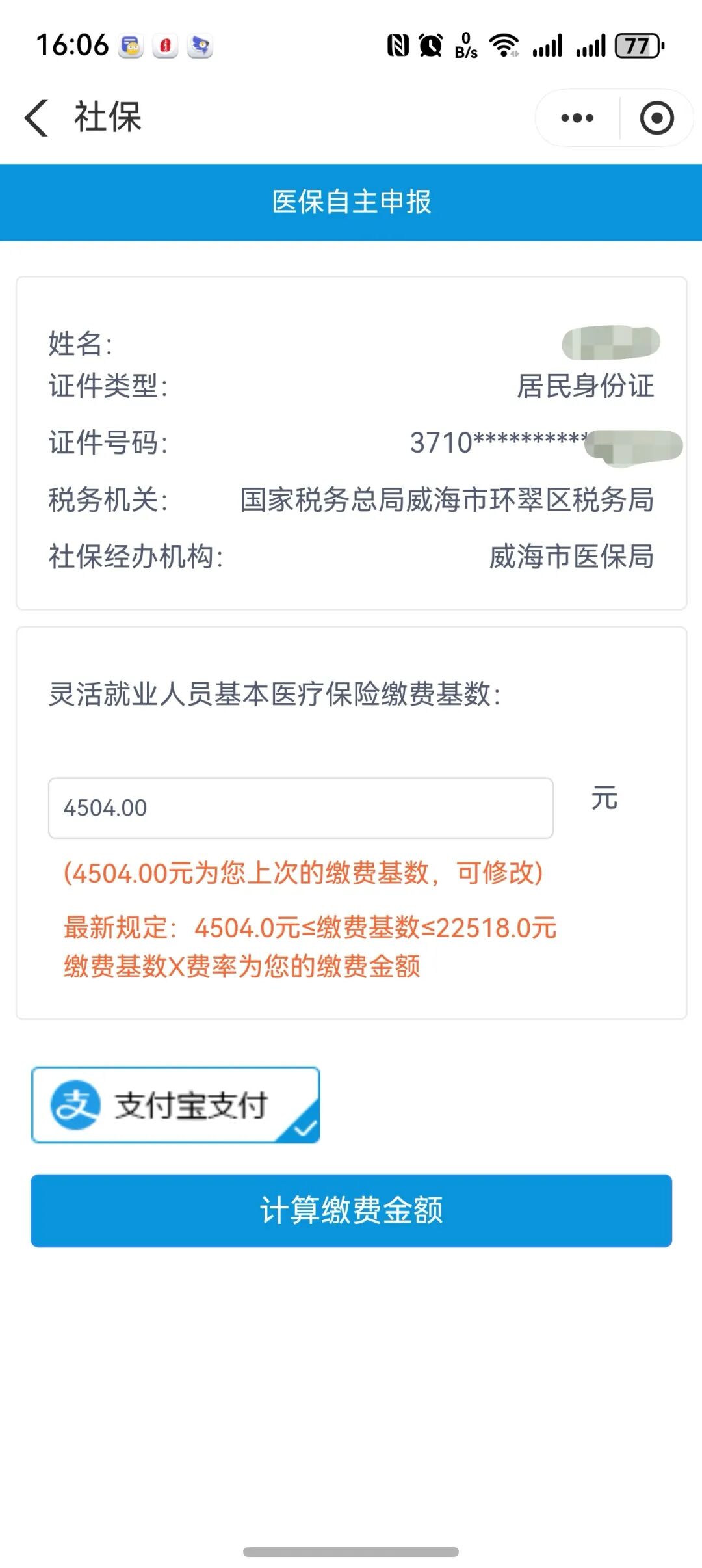 3.输入缴费基数(输入4504),点击灵活就业人员大额医疗互助保险缴费金额1.25元,长期护理保险(个人缴纳)缴费金额1.25元,确认后点击“计算缴费金额”;
