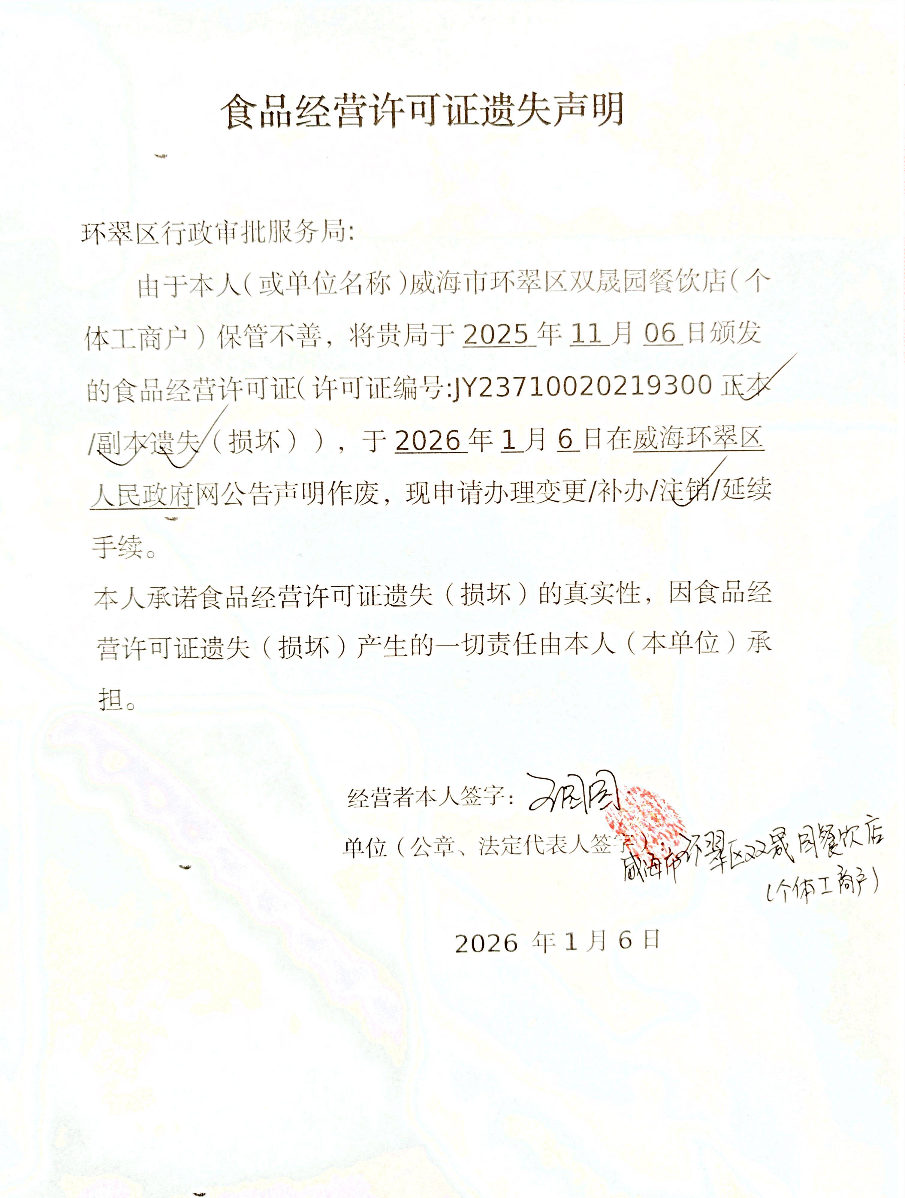 关于威海市环翠区双晟园餐饮店(个体工商户)食品经营许可证的遗失声明