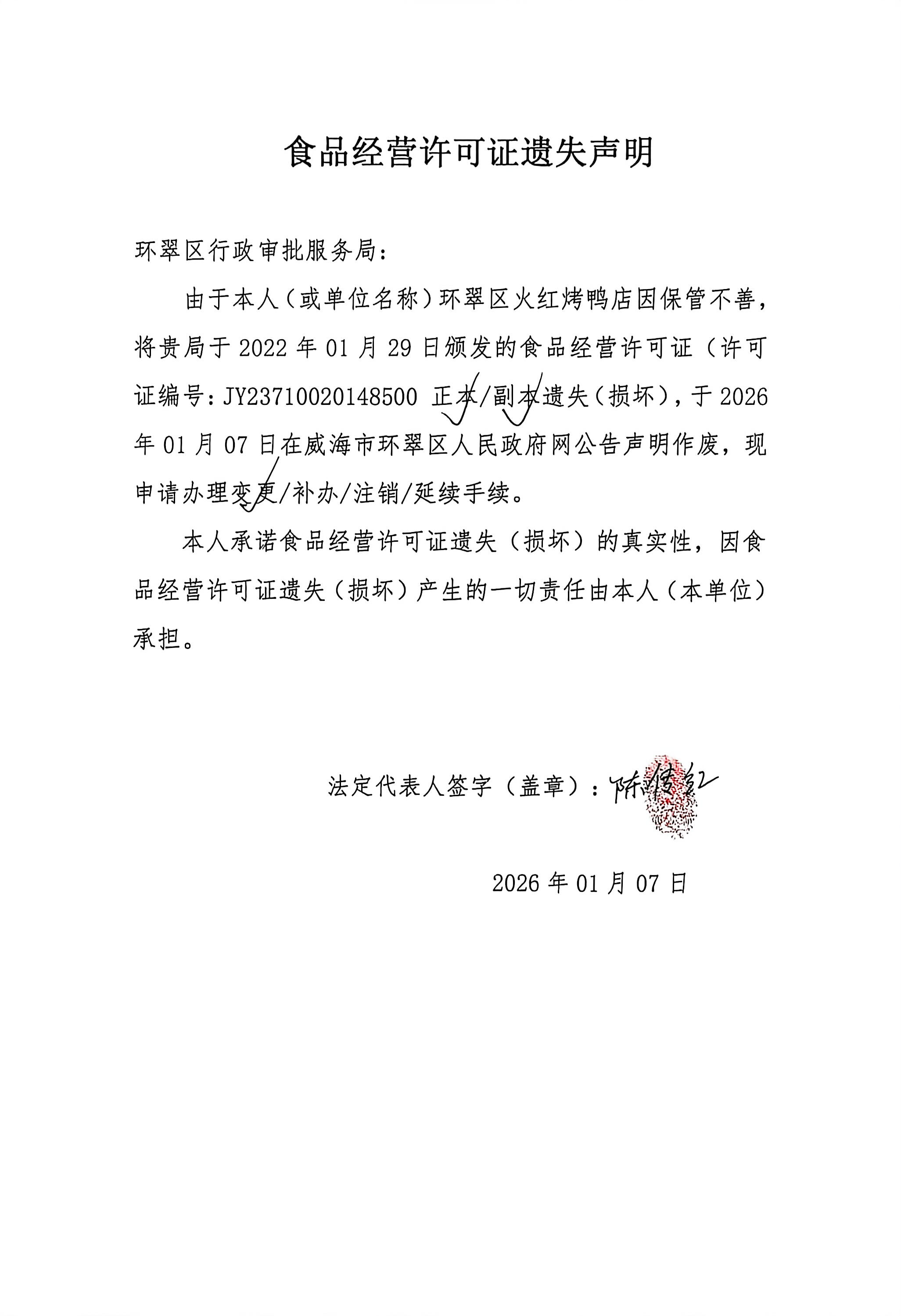 关于环翠区火红烤鸭店食品经营许可证的遗失声明