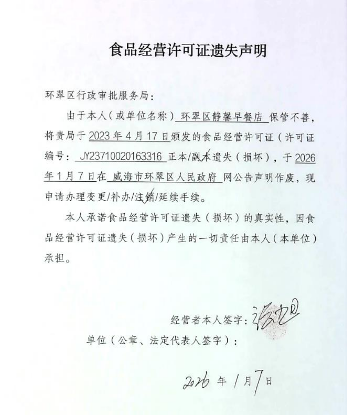 关于环翠区静馨早餐店食品经营许可证的遗失声明