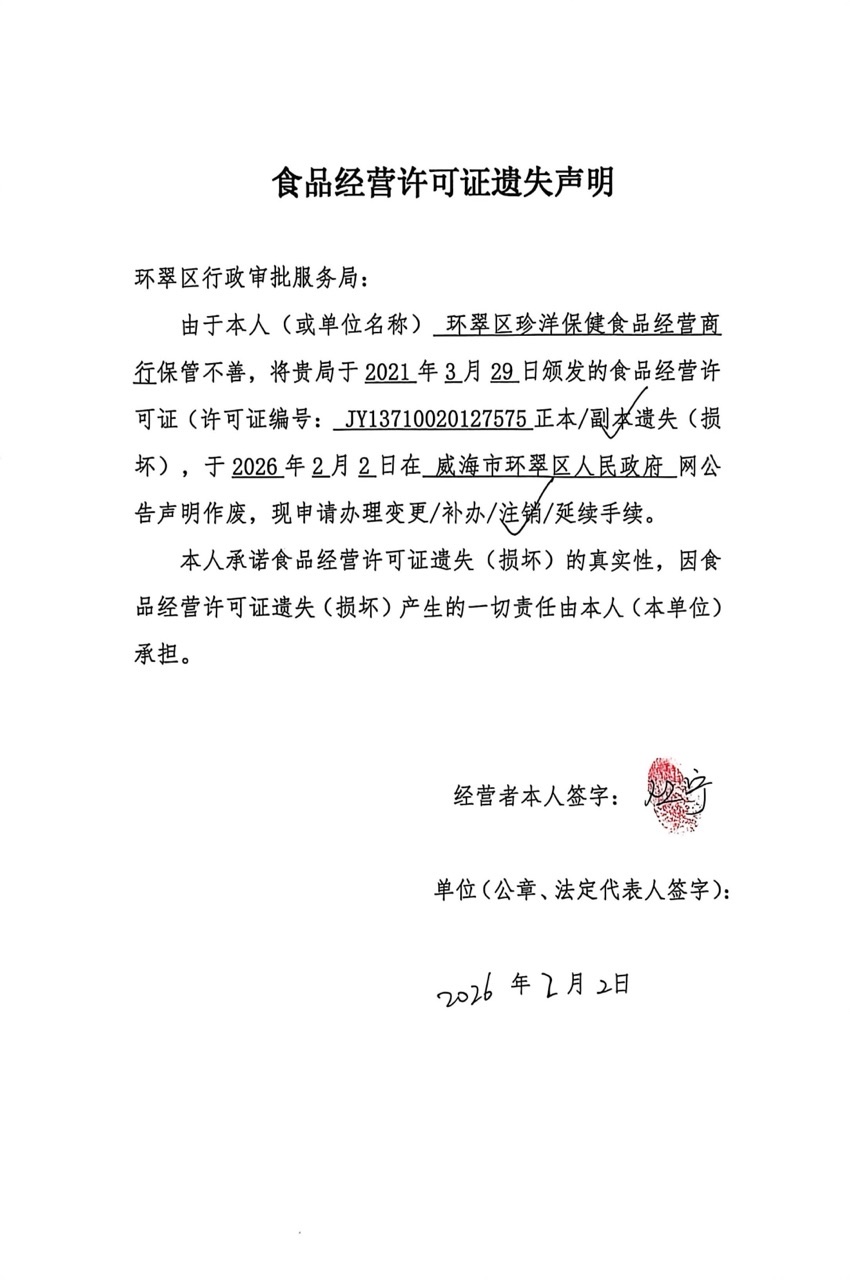 关于环翠区珍洋保健食品经营商行食品经营许可证的遗失声明