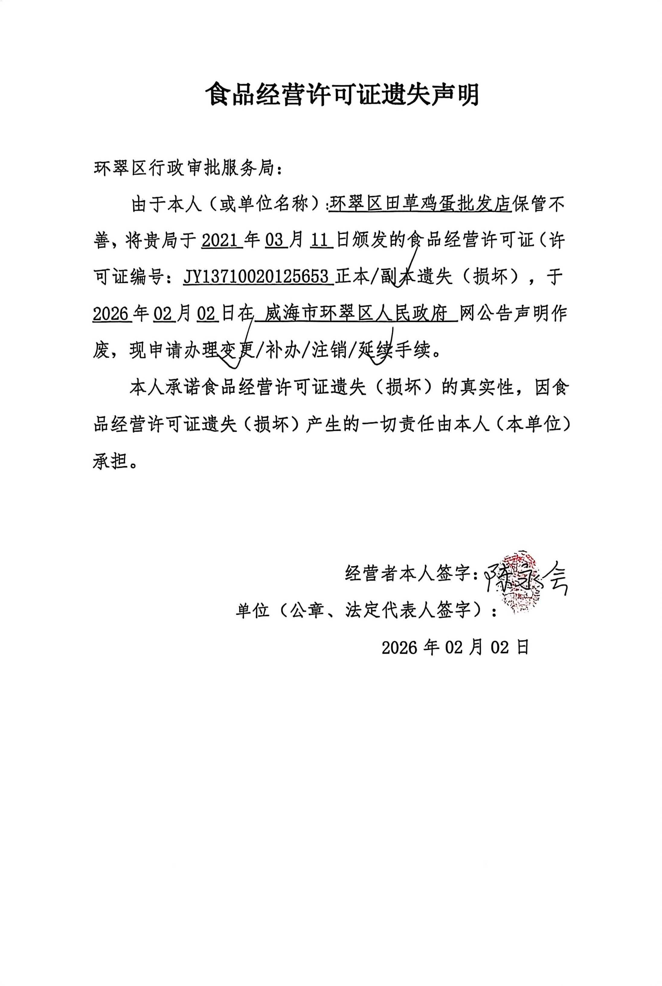 关于环翠区田草鸡蛋批发店食品经营许可证的遗失声明