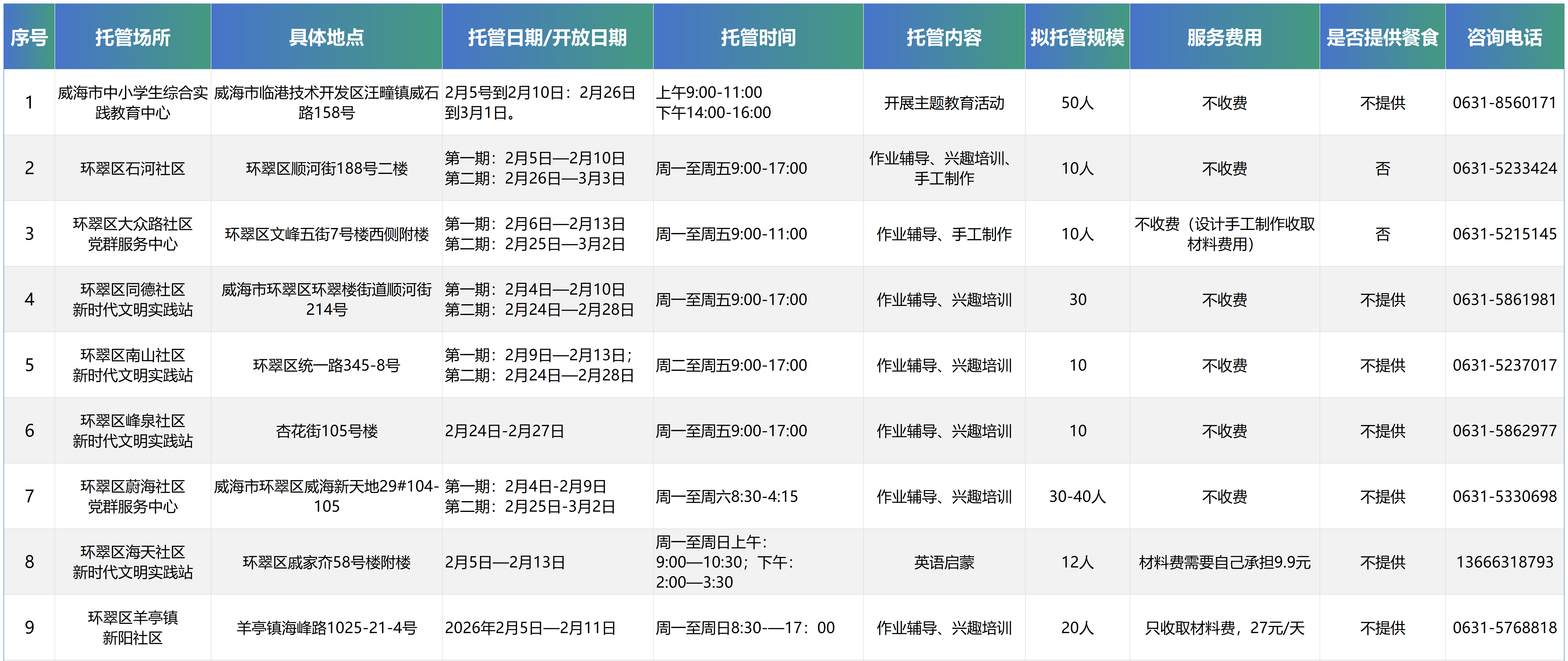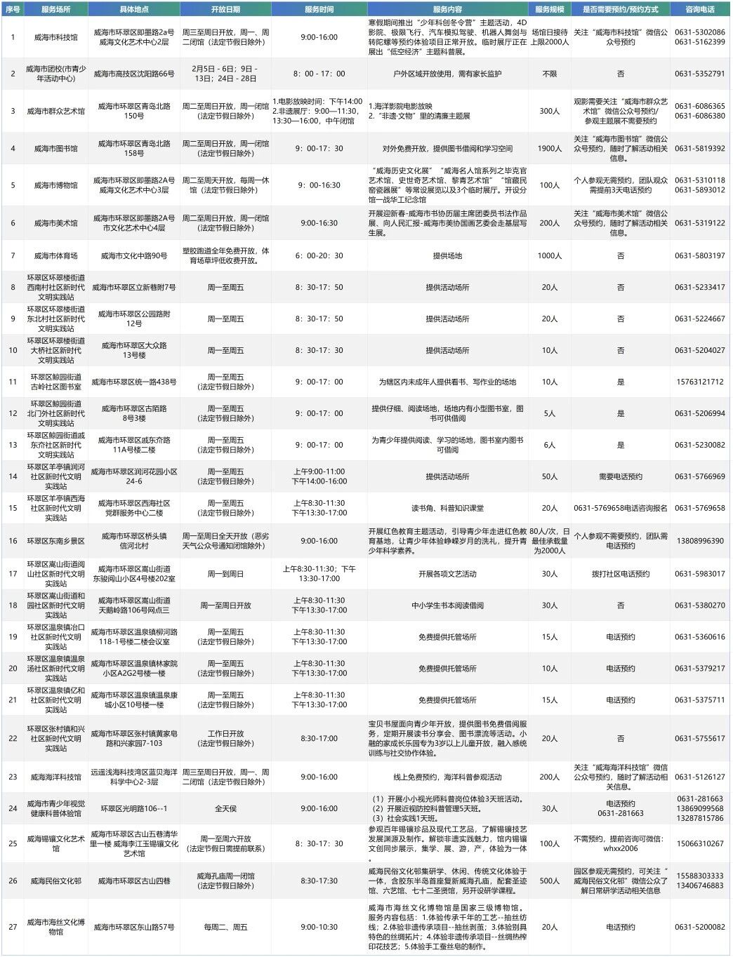 2026年寒假公益开放场所、托管服务资源清单