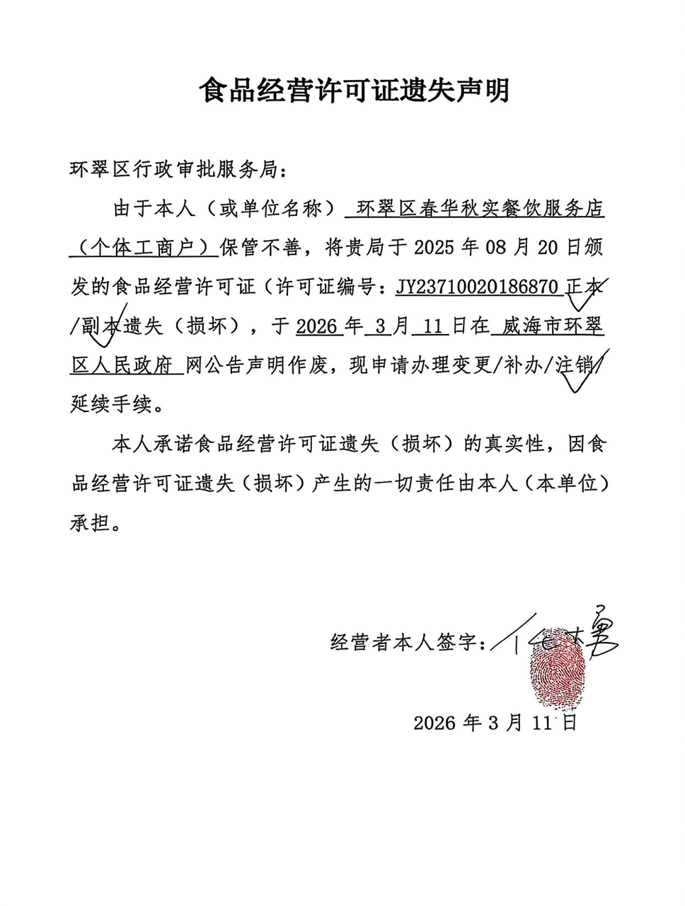 关于环翠区春华秋实餐饮服务店(个体工商户)食品经营许可证的遗失声明