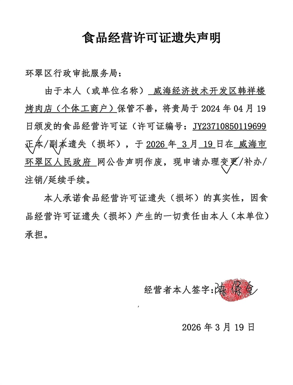 关于威海经济技术开发区韩祥楼烤肉店(个体工商户)食品经营许可证的遗失声明