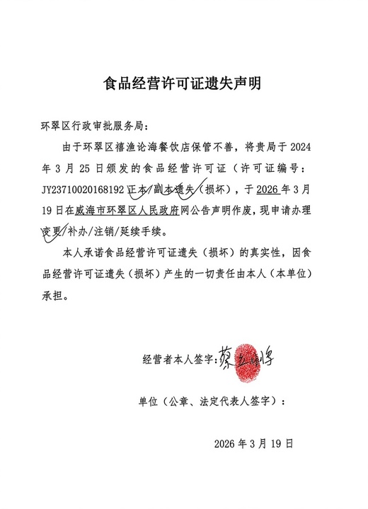 关于环翠区禧渔论海餐饮店食品经营许可证的遗失声明