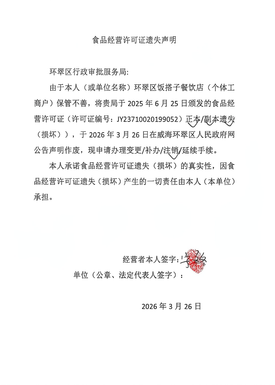 关于环翠区饭搭子餐饮店(个体工商户)食品经营许可证的遗失声明