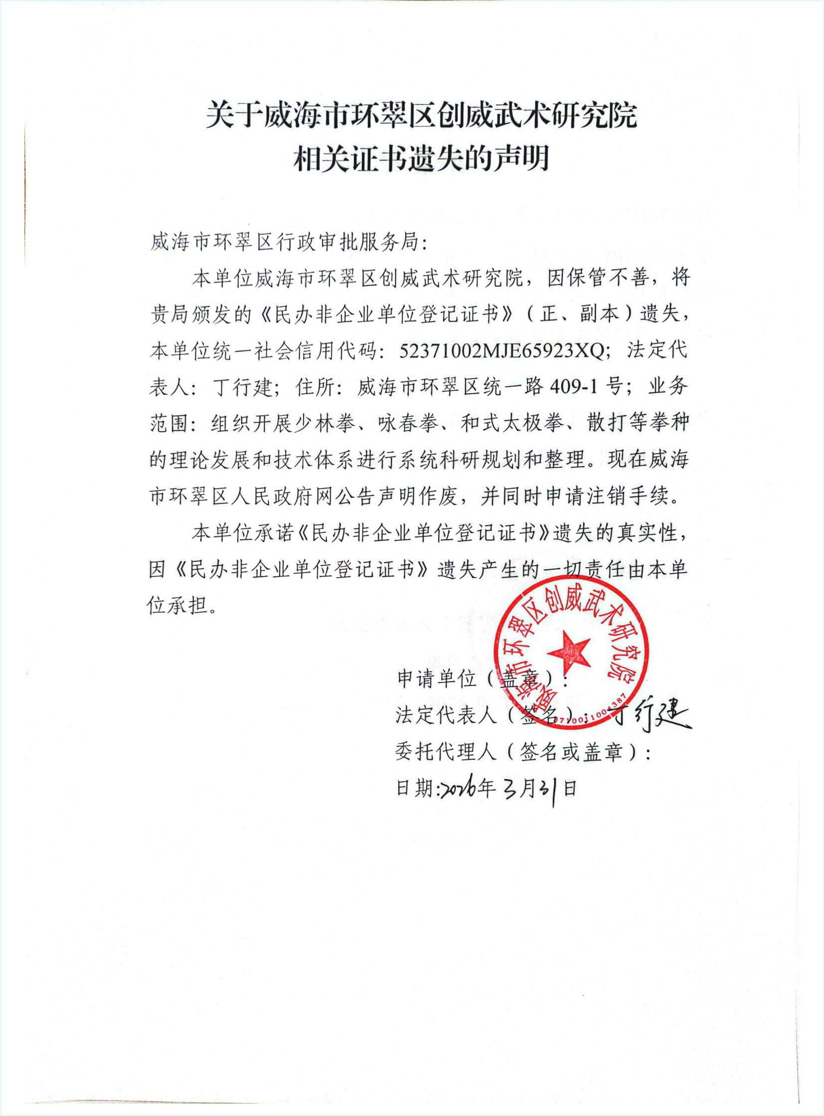 关于威海市环翠区创威武术研究院相关证书遗失的声明