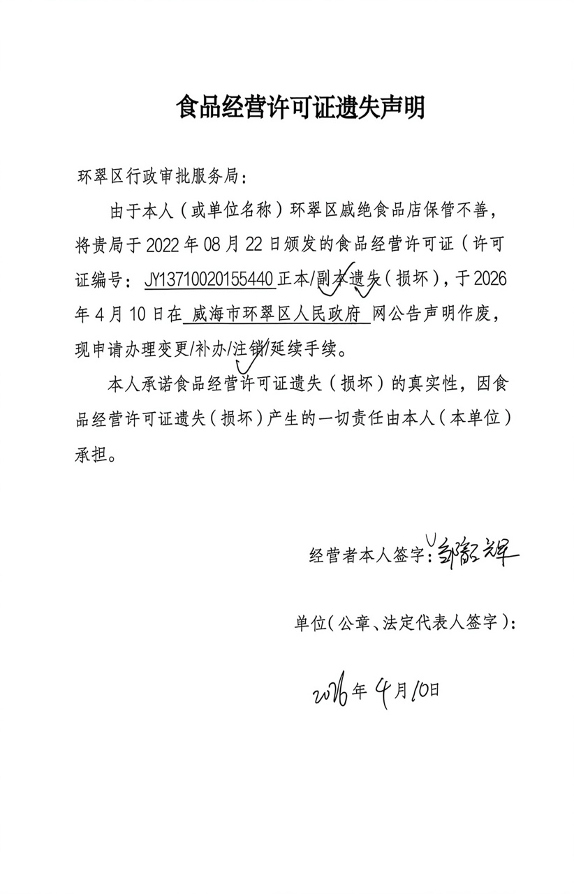 关于环翠区戚绝食品店食品经营许可证的遗失声明