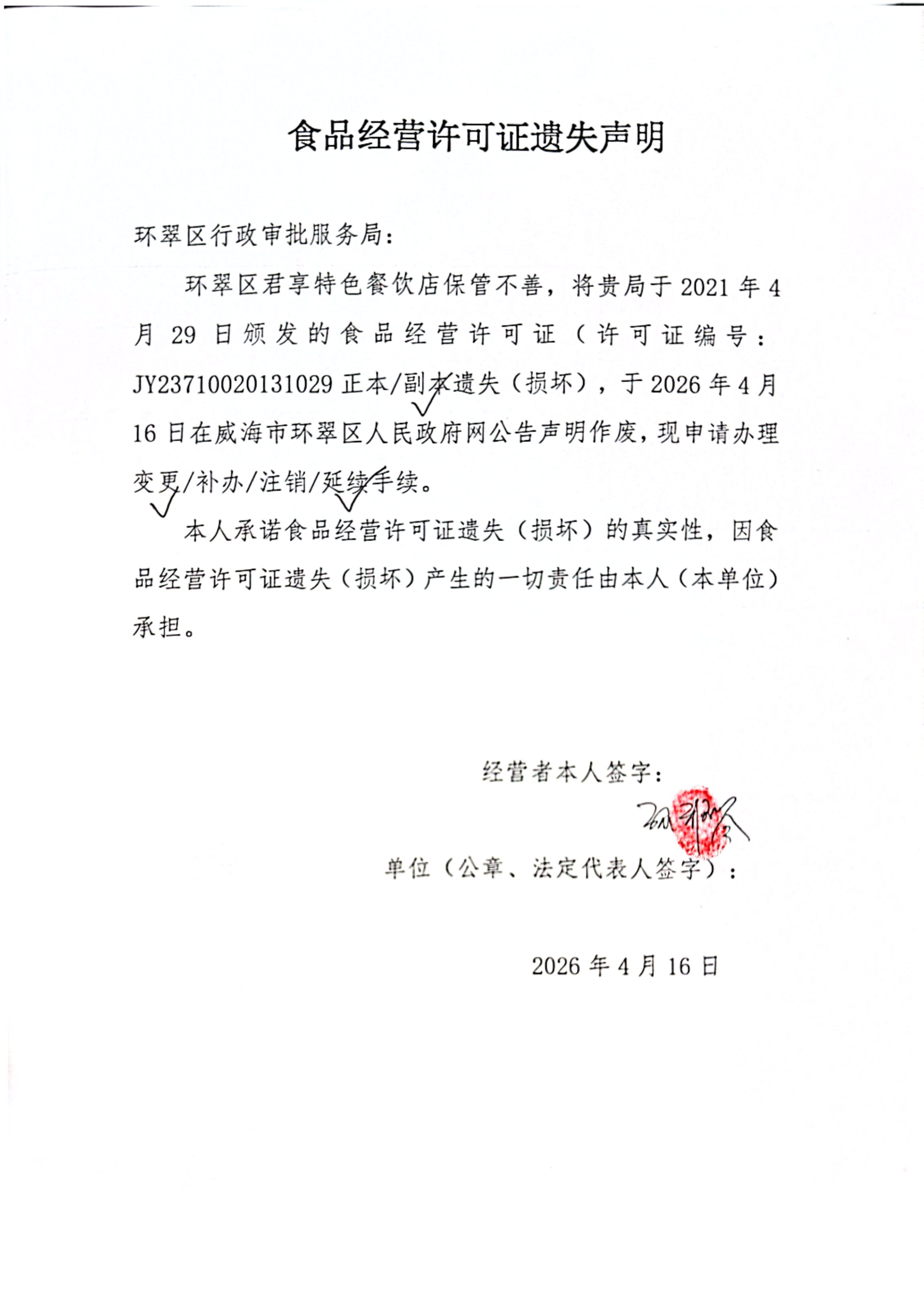 关于环翠区君享特色餐饮店食品经营许可证的遗失声明