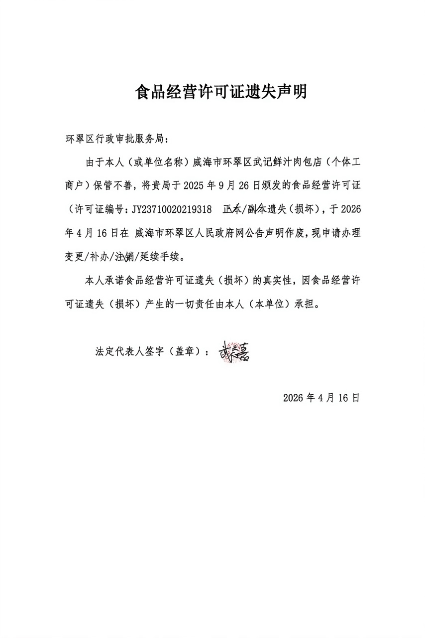 关于威海市环翠区武记鲜汁肉包店(个体工商户)食品经营许可证的遗失声明