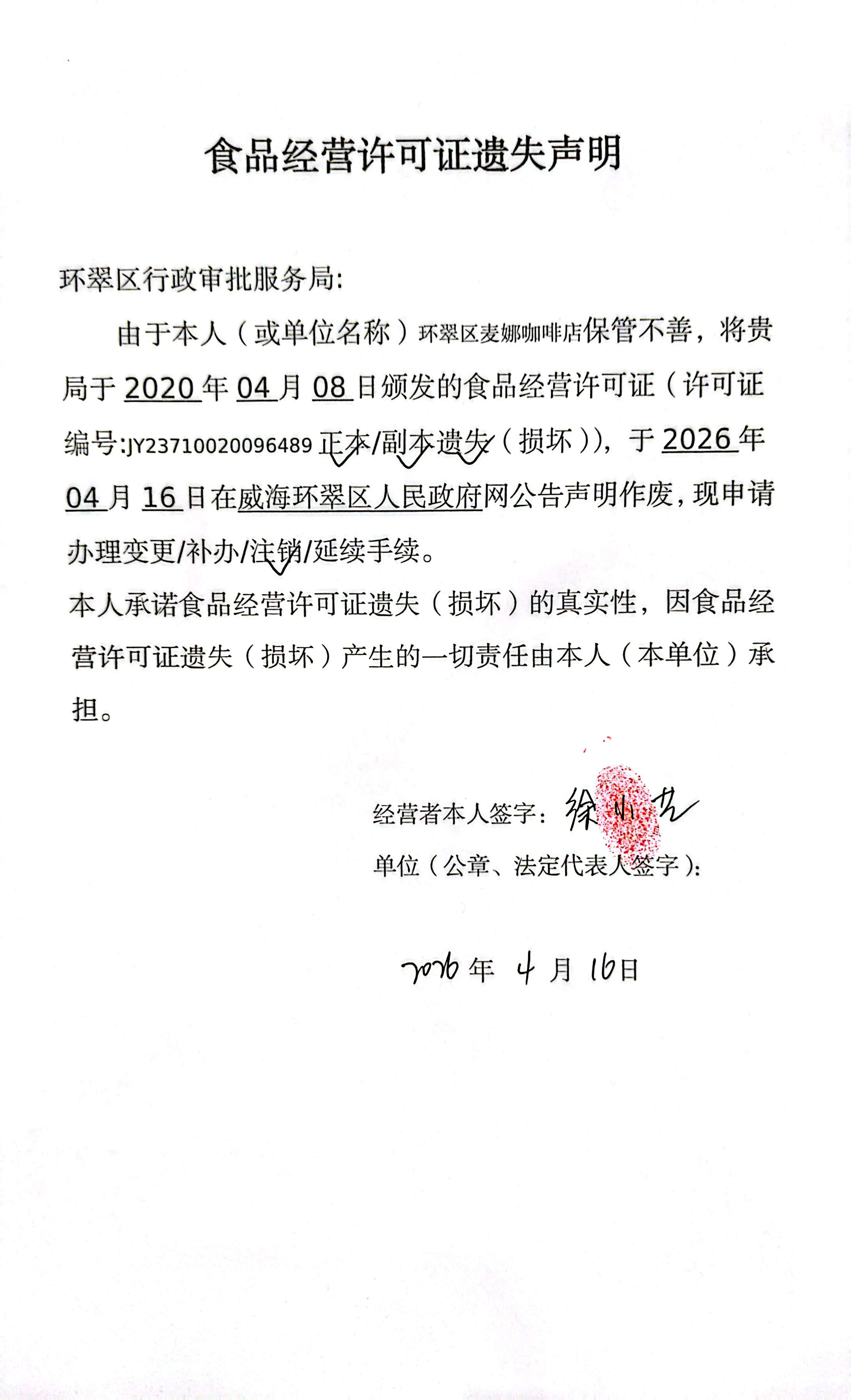 关于环翠区麦娜咖啡店食品经营许可证的遗失声明