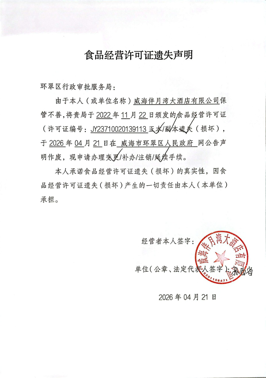关于威海伴月湾大酒店有限公司食品经营许可证的遗失声明