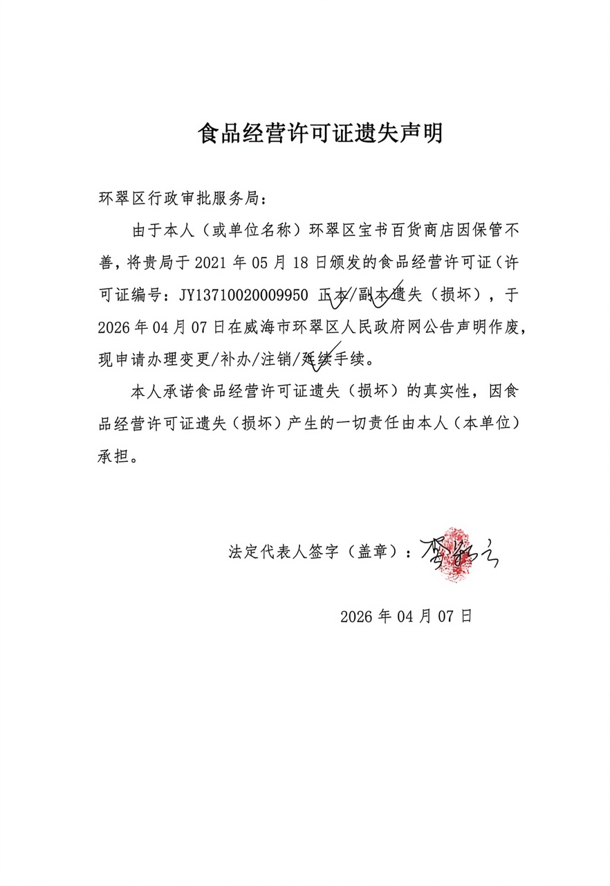 关于环翠区宝书百货商店食品经营许可证的遗失声明