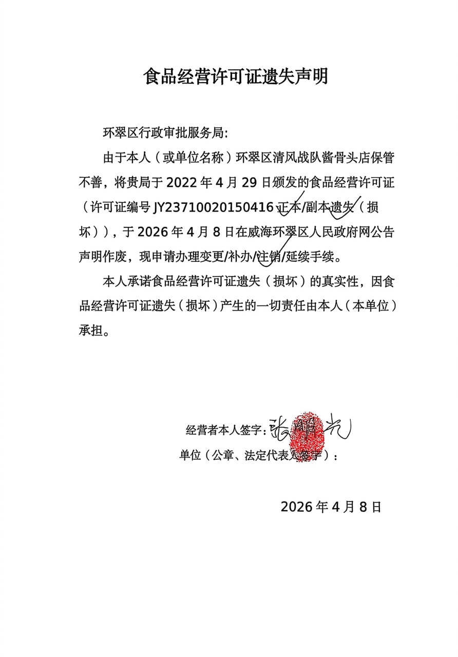 关于环翠区清风战队酱骨头店食品经营许可证的遗失声明