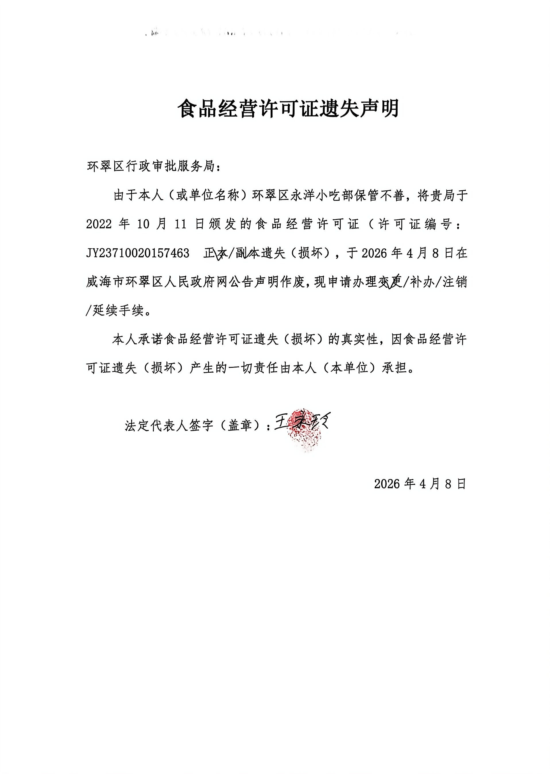 关于环翠区永洋小吃部食品经营许可证的遗失声明