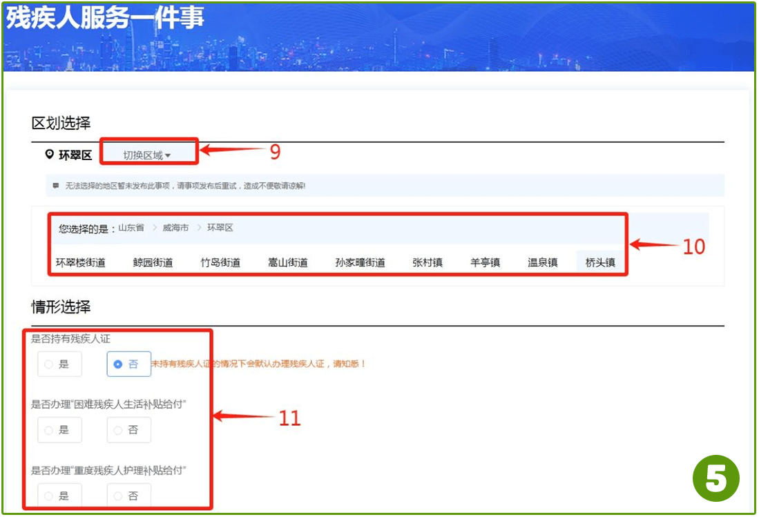 10 | 竹岛街道便民服务中心 | 威海市环翠区竹岛街道南竹岛C区21号 | 残疾人服务“一件事”窗口 | 0631-5308908 |