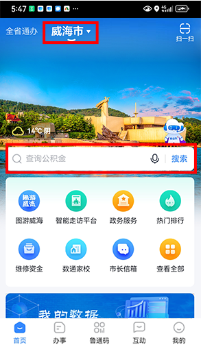 2首页左上角选择进入“威海市”,点击搜索栏。