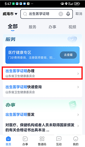 3在搜索栏搜索关键词“出生医学证明”,点击【出生医学证明办理】进入指定服务。