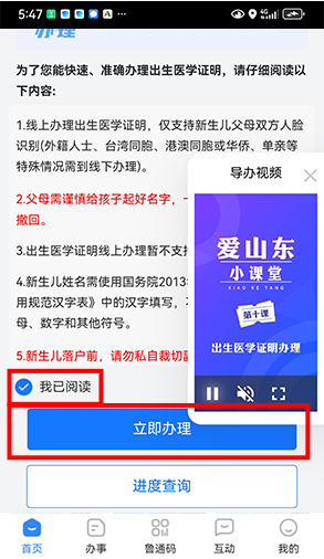 4可先观看导办视频了解详细操作流程。认真阅读《办理须知》后勾选【我已阅读】,然后点击【立即办理】按钮。