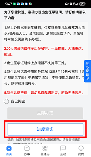 6提交申请后,可在“出生医学证明办理”服务首页进行办理进度查询。