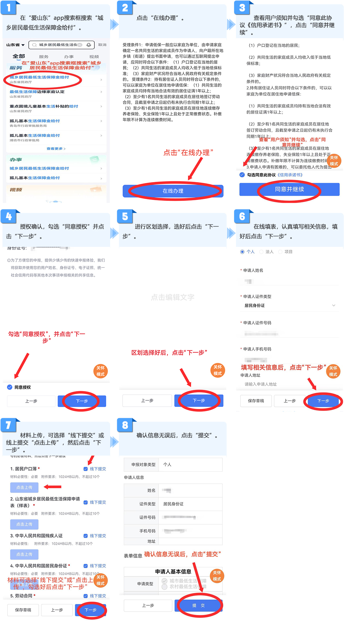 4.低保申请家庭及其法定赡养、抚养、扶养人家庭共同签署《威海市城乡困难家庭经济状况核对诚信承诺及委托授权书》,授权低保经办机构查询核对;